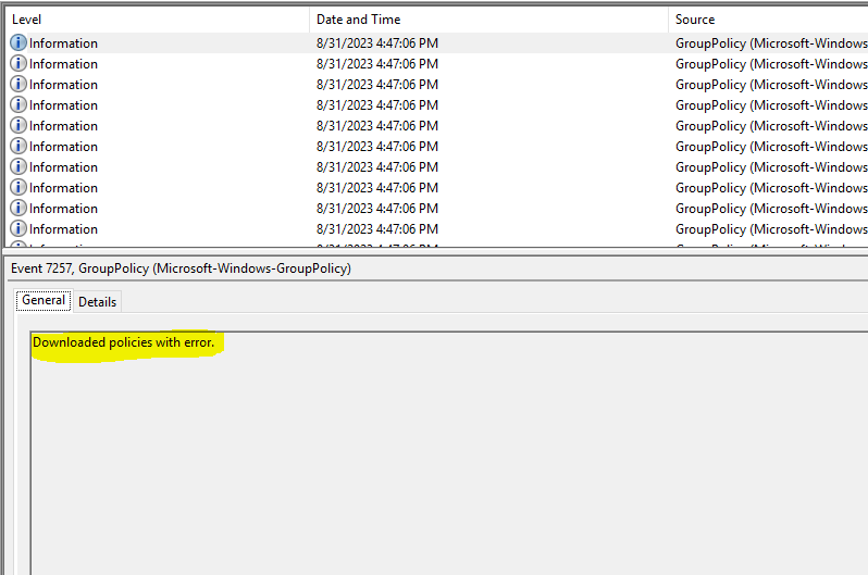 Naturally, I turned to the Group Policy Operational log in Event Viewer, expecting a clear error trail, but surprisingly, there were no error events at all! Just a single informational event containing one curious clue, as shown here: